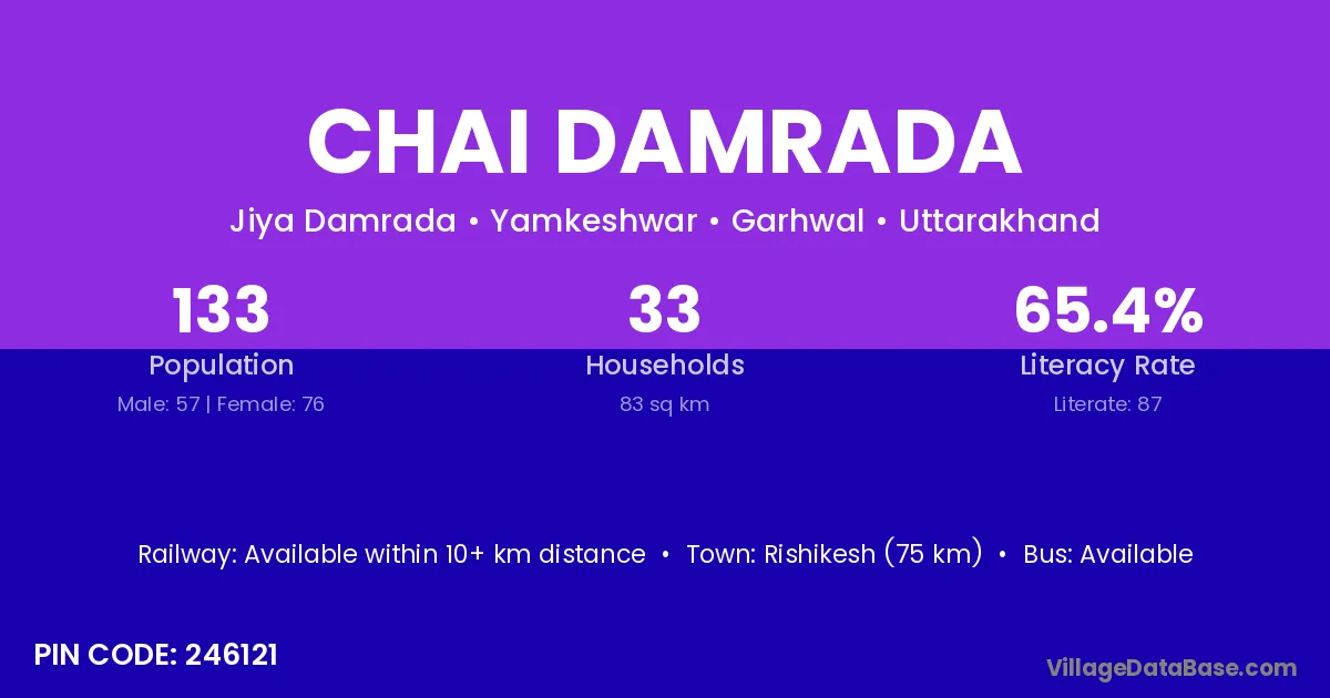 Rishikesh (75 km) is the nearest town to Chai Damrada village for major economic activities and is located approximately 75 km away.