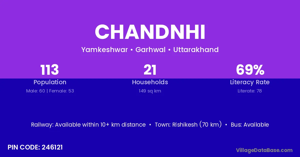 Rishikesh (70 km) is the nearest town to Chandnhi village for major economic activities and is located approximately 70 km away.
