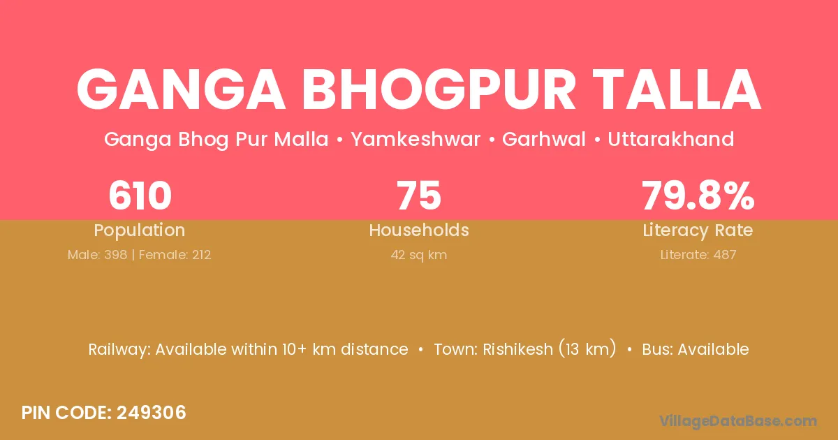 Ganga Bhogpur Talla village has a total population of 610 people, of which 398 are males and 212 are females.