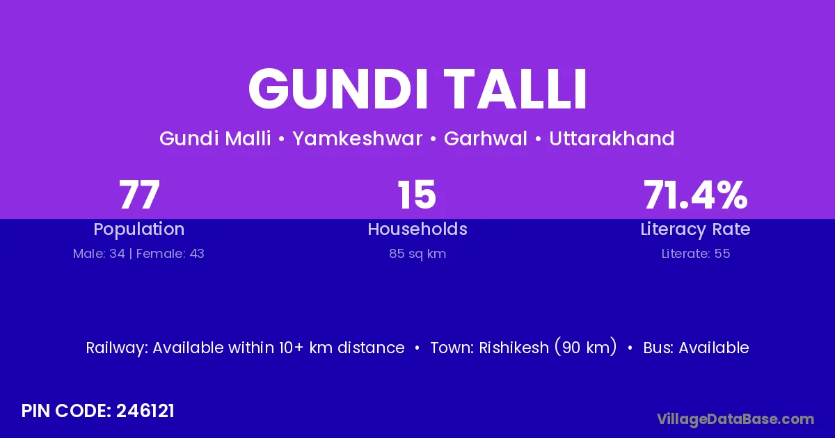 Rishikesh (90 km) is the nearest town to Gundi Talli village for major economic activities and is located approximately 90 km away.