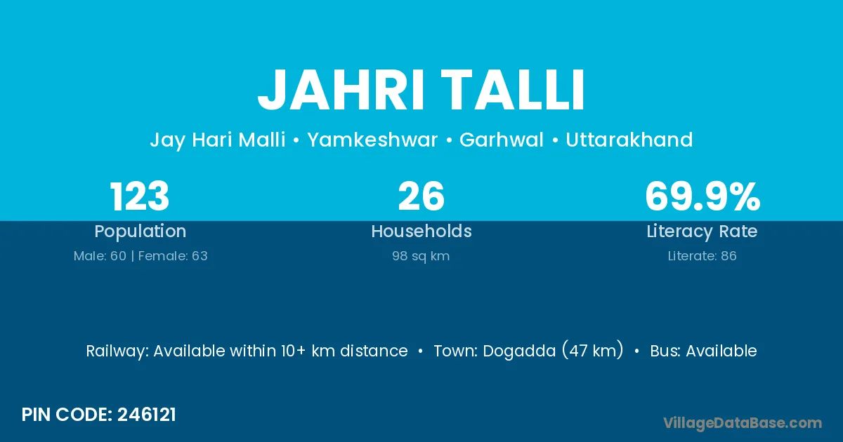Jahri Talli village has a total population of 123 people, of which 60 are males and 63 are females.