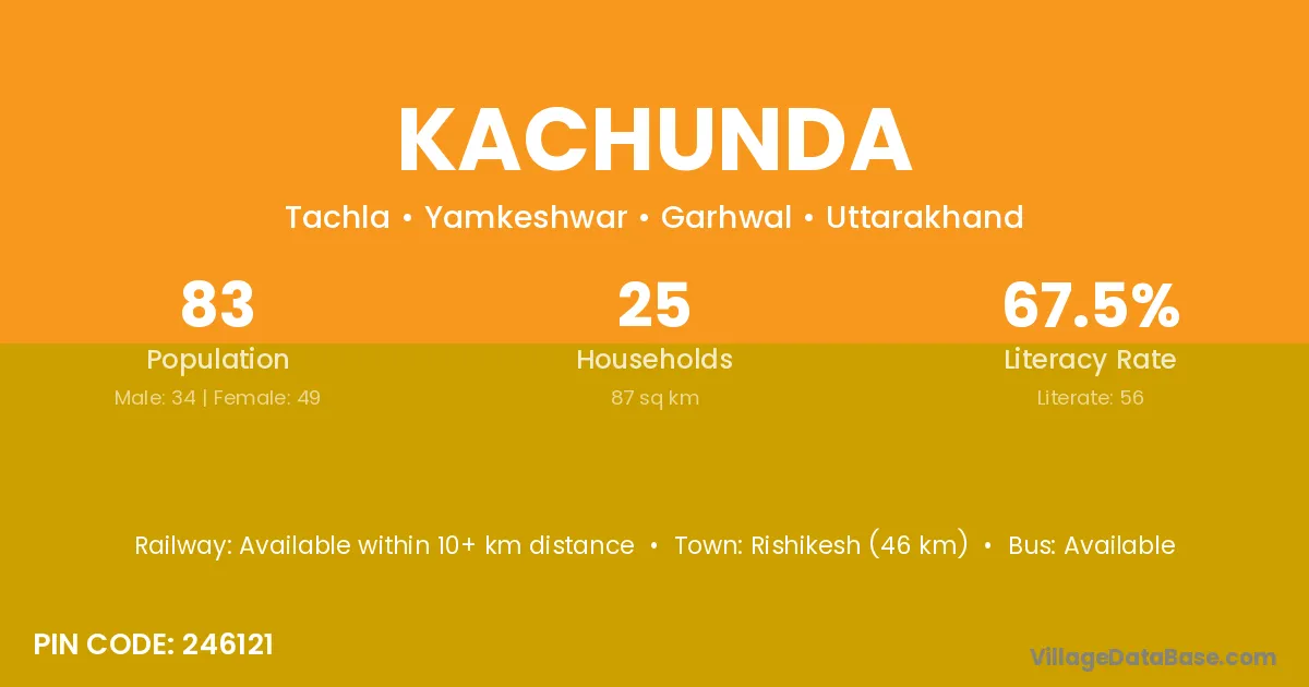 Rishikesh (46 km) is the nearest town to Kachunda village for major economic activities and is located approximately 46 km away.