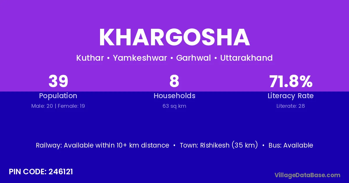 Rishikesh (35 km) is the nearest town to Khargosha village for major economic activities and is located approximately 35 km away.