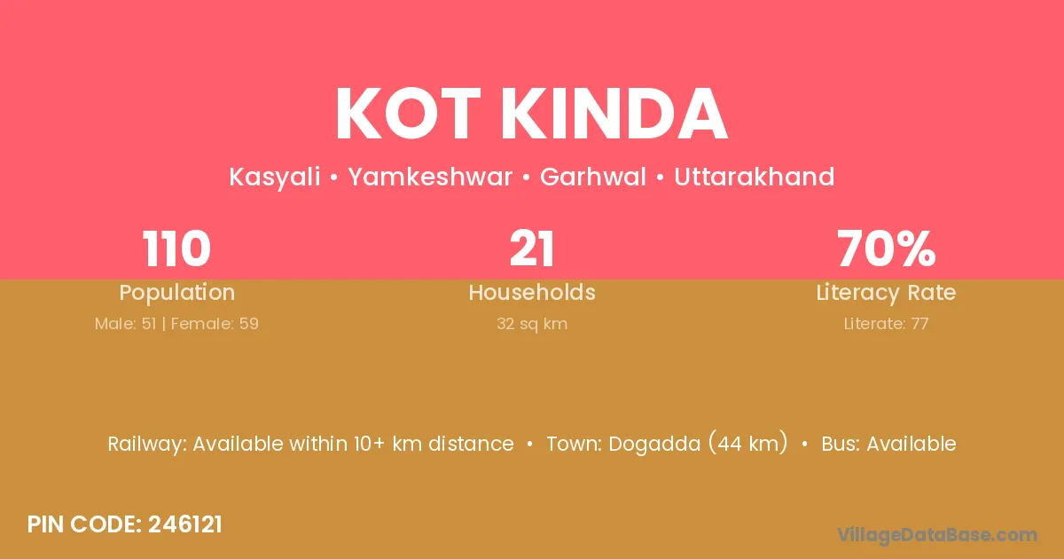 Dogadda (44 km) is the nearest town to Kot Kinda village for major economic activities and is located approximately 44 km away.