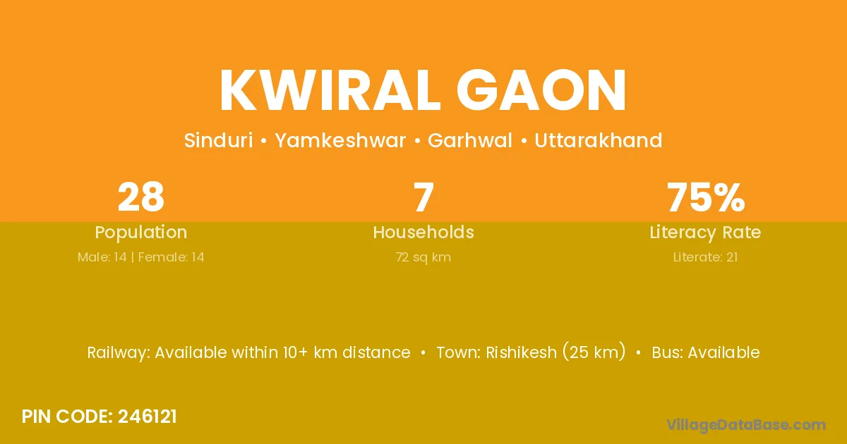 Rishikesh (25 km) is the nearest town to Kwiral Gaon village for major economic activities and is located approximately 25 km away.