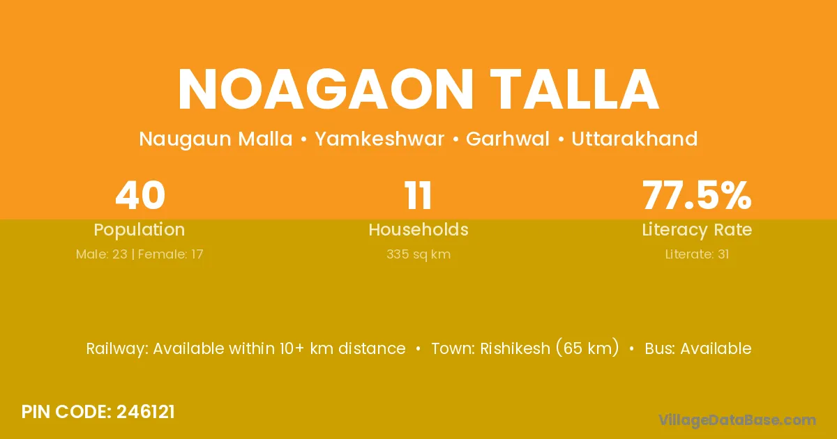 Rishikesh (65 km) is the nearest town to Noagaon Talla village for major economic activities and is located approximately 65 km away.