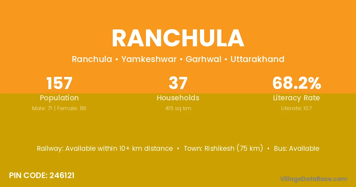 Rishikesh (75 km) is the nearest town to Ranchula village for major economic activities and is located approximately 75 km away.