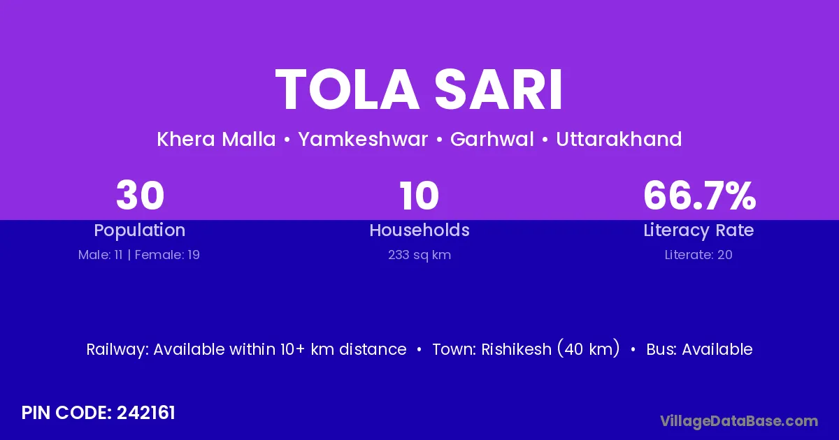 Rishikesh (40 km) is the nearest town to Tola Sari village for major economic activities and is located approximately 40 km away.