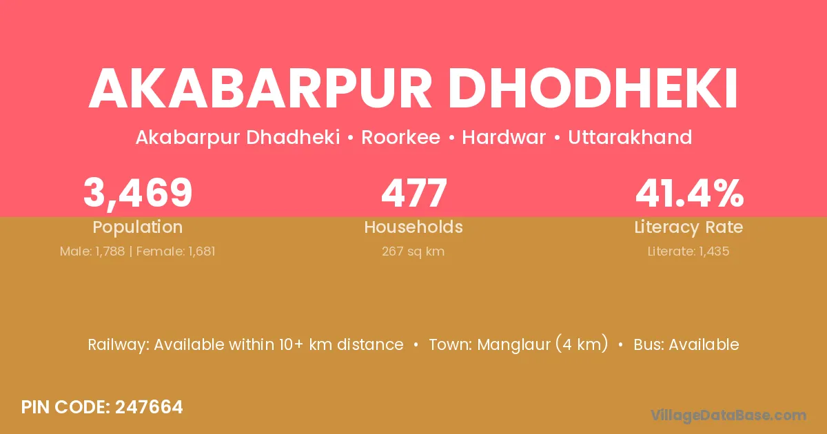 Manglaur (4 km) is the nearest town to Akabarpur Dhodheki village for major economic activities and is located approximately 4 km away.