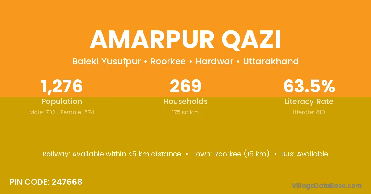 Roorkee (15 km) is the nearest town to Amarpur Qazi village for major economic activities and is located approximately 15 km away.