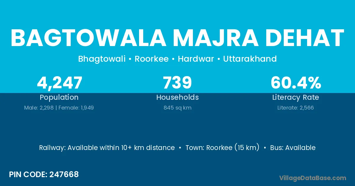 Roorkee (15 km) is the nearest town to Bagtowala Majra Dehat village for major economic activities and is located approximately 15 km away.