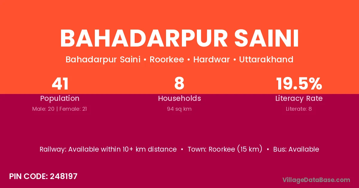 Roorkee (15 km) is the nearest town to Bahadarpur Saini village for major economic activities and is located approximately 15 km away.