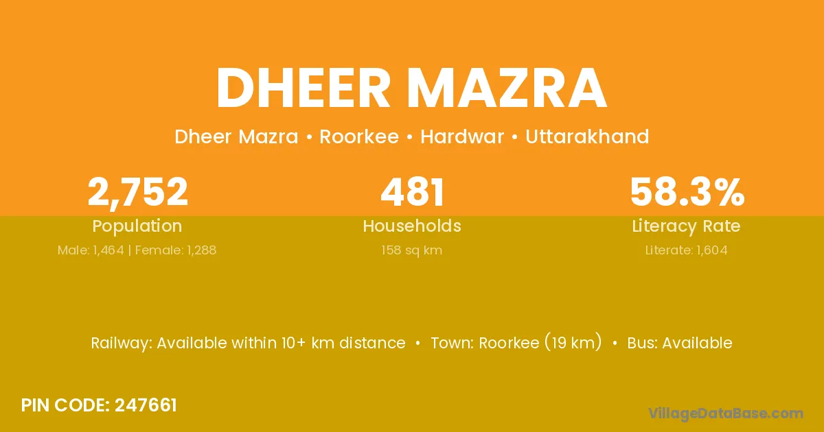 Roorkee (19 km) is the nearest town to Dheer Mazra village for major economic activities and is located approximately 19 km away.