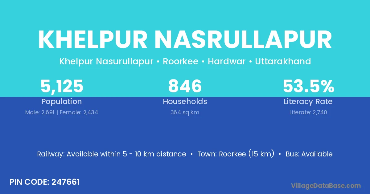 Roorkee (15 km) is the nearest town to Khelpur Nasrullapur village for major economic activities and is located approximately 15 km away.