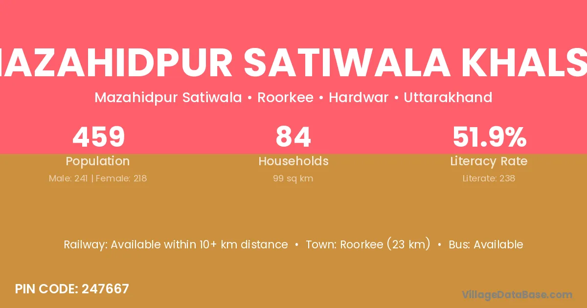 Roorkee (23 km) is the nearest town to Mazahidpur Satiwala Khalsa village for major economic activities and is located approximately 23 km away.