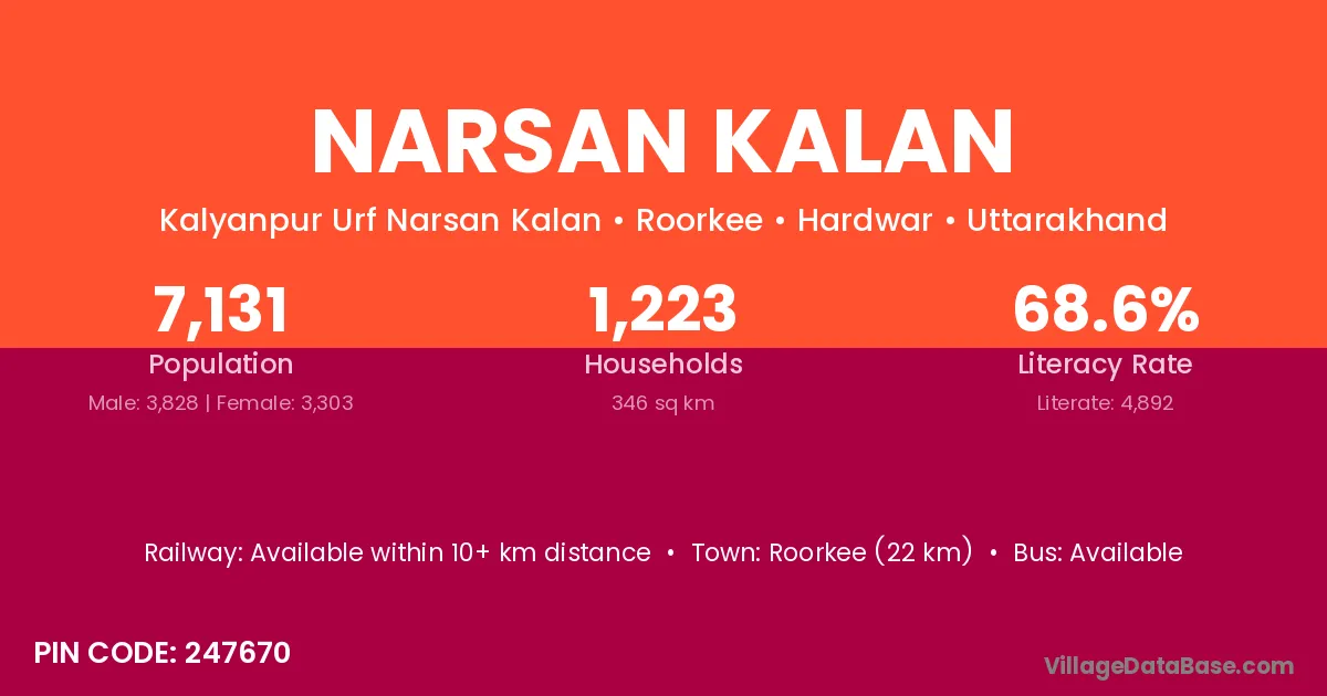 Roorkee (22 km) is the nearest town to Narsan Kalan village for major economic activities and is located approximately 22 km away.