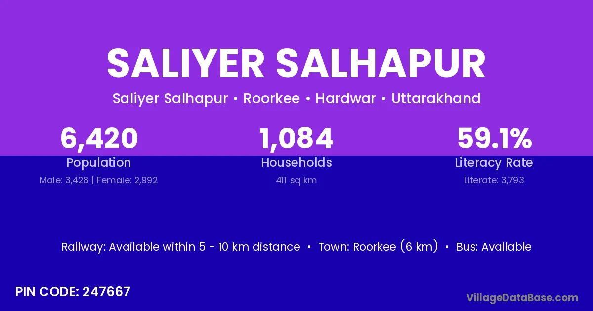 Roorkee (6 km) is the nearest town to Saliyer Salhapur village for major economic activities and is located approximately 6 km away.