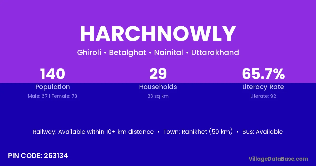 Ranikhet (50 km) is the nearest town to Harchnowly village for major economic activities and is located approximately 50 km away.