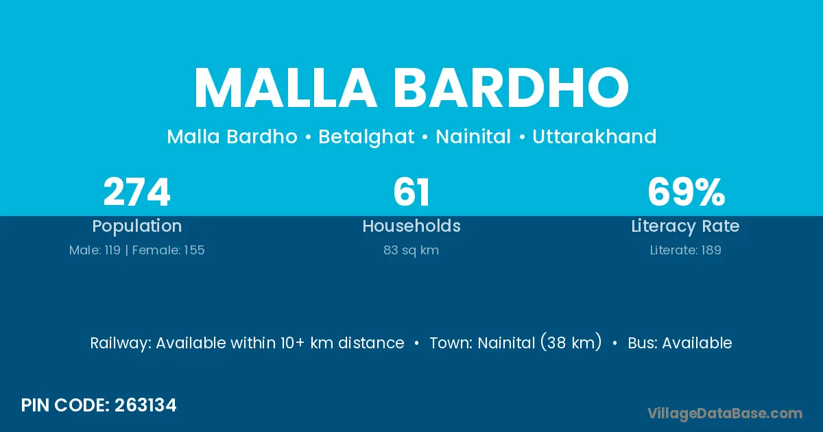 Nainital (38 km) is the nearest town to Malla Bardho village for major economic activities and is located approximately 38 km away.