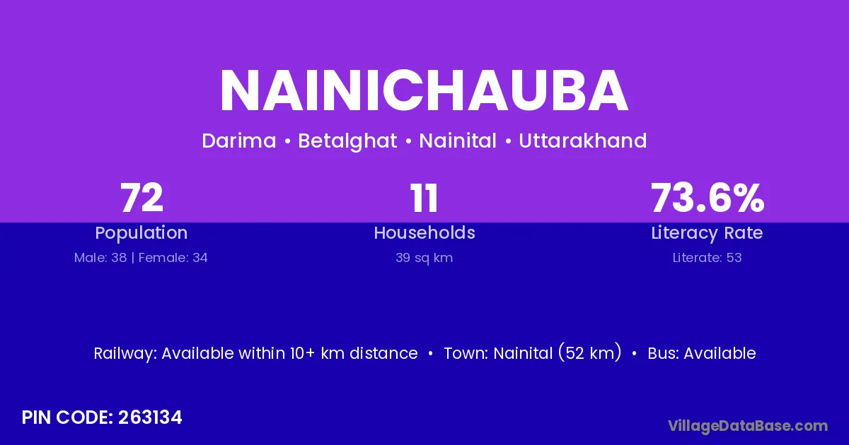 Nainital (52 km) is the nearest town to Nainichauba village for major economic activities and is located approximately 52 km away.