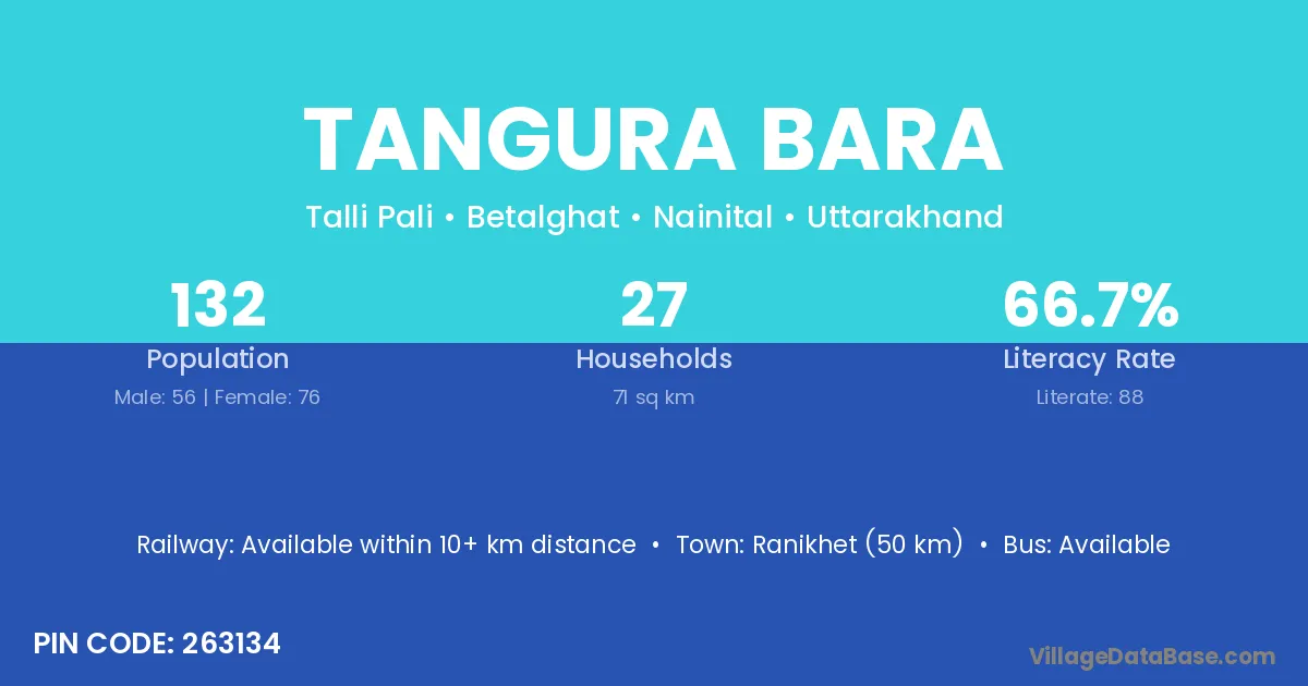Ranikhet (50 km) is the nearest town to Tangura Bara village for major economic activities and is located approximately 50 km away.