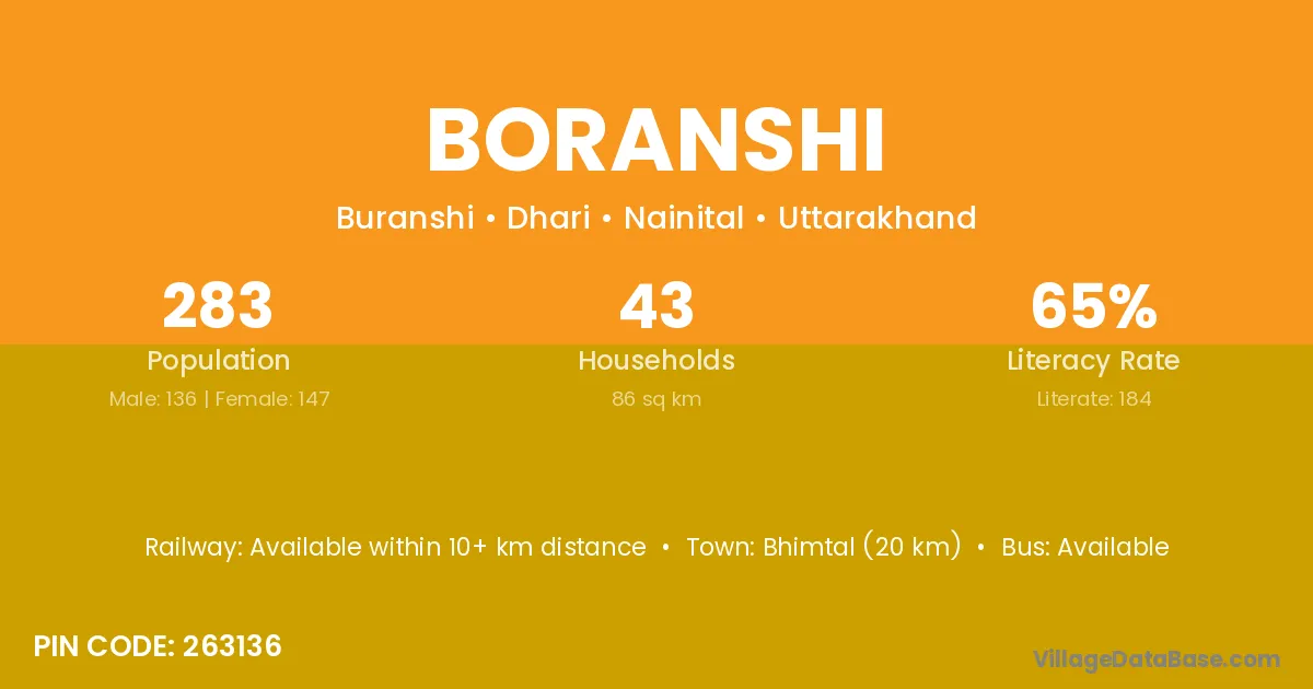 Bhimtal (20 km) is the nearest town to Boranshi village for major economic activities and is located approximately 20 km away.
