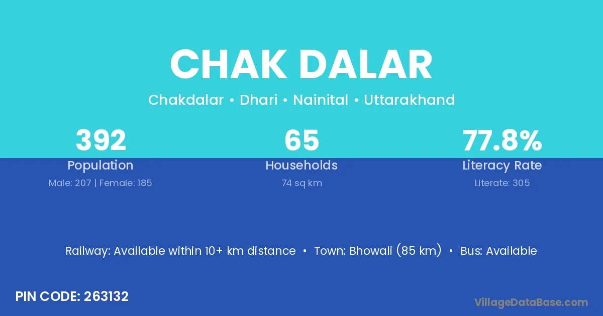 Bhowali (85 km) is the nearest town to Chak Dalar village for major economic activities and is located approximately 85 km away.
