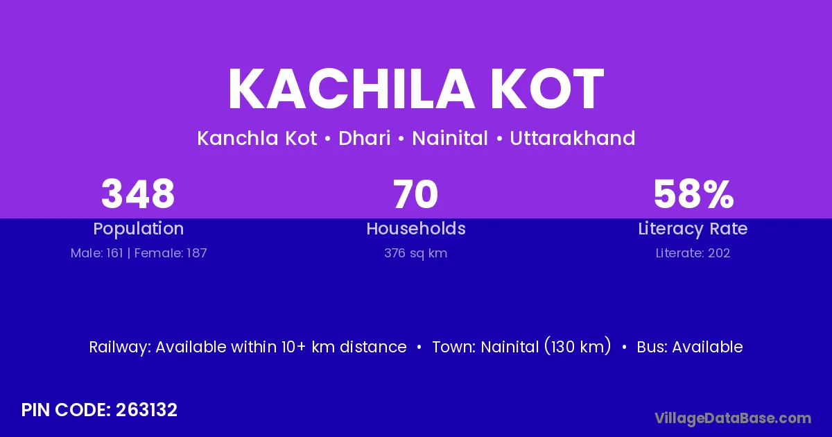 Nainital (130 km) is the nearest town to Kachila Kot village for major economic activities and is located approximately 130 km away.