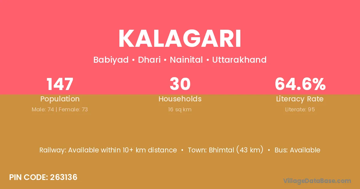 Bhimtal (43 km) is the nearest town to Kalagari village for major economic activities and is located approximately 43 km away.