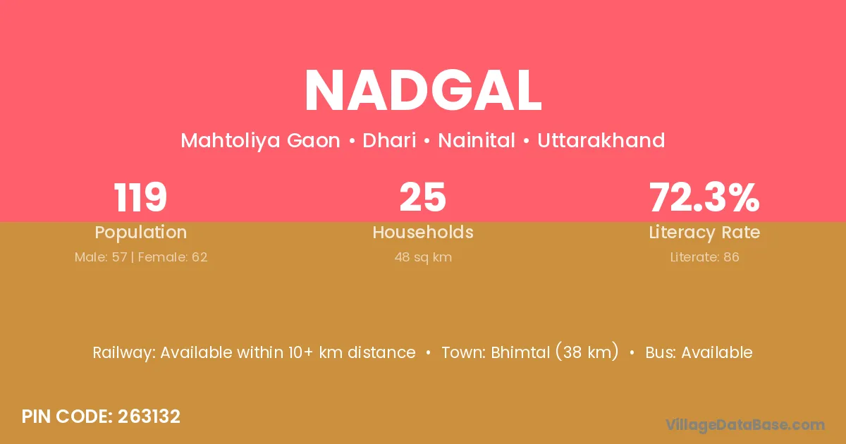 Bhimtal (38 km) is the nearest town to Nadgal village for major economic activities and is located approximately 38 km away.