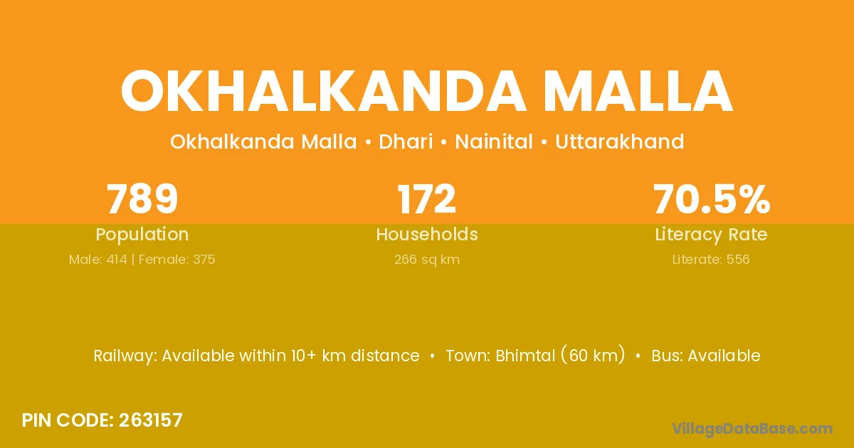Bhimtal (60 km) is the nearest town to Okhalkanda Malla village for major economic activities and is located approximately 60 km away.