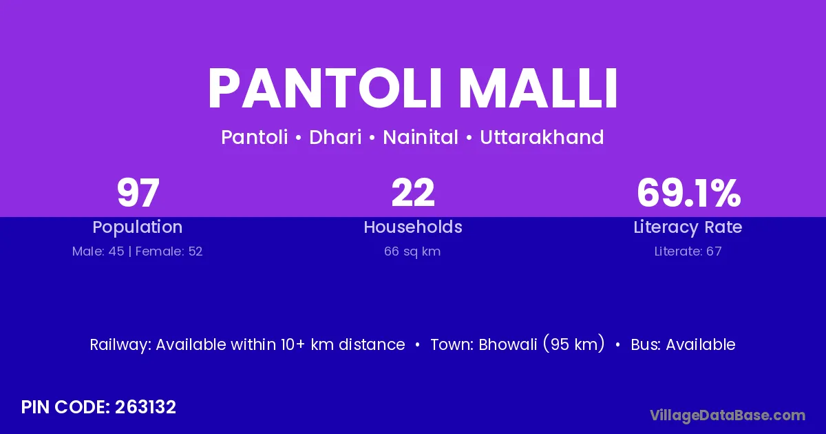Bhowali (95 km) is the nearest town to Pantoli Malli village for major economic activities and is located approximately 95 km away.