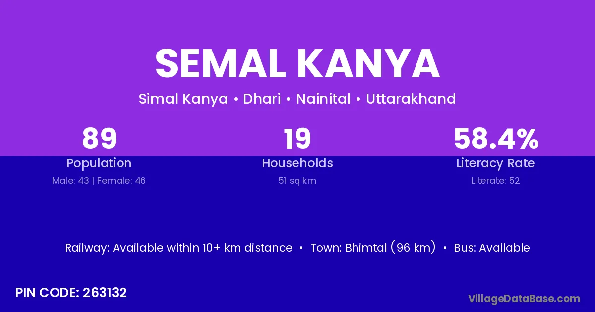 Bhimtal (96 km) is the nearest town to Semal Kanya village for major economic activities and is located approximately 96 km away.