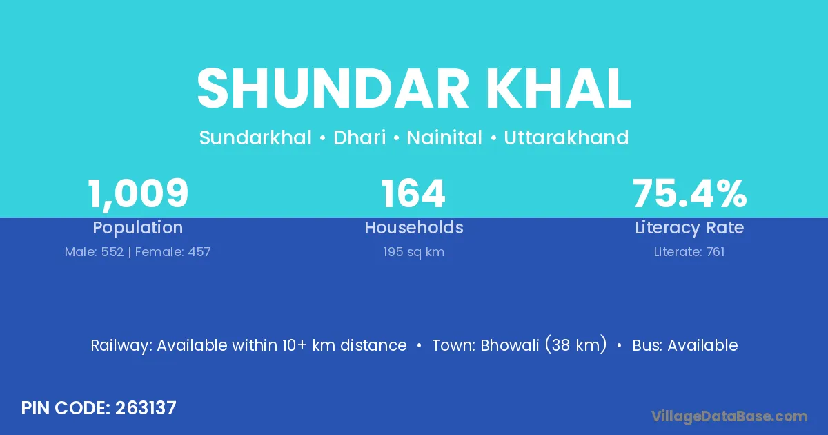 Bhowali (38 km) is the nearest town to Shundar Khal village for major economic activities and is located approximately 38 km away.