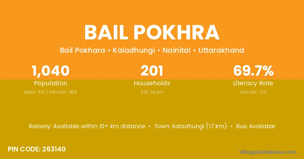 Kaladhungi (17 km) is the nearest town to Bail Pokhra village for major economic activities and is located approximately 17 km away.