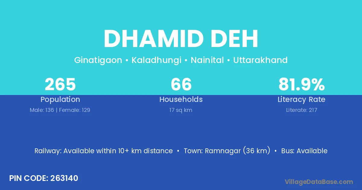 Ramnagar (36 km) is the nearest town to Dhamid Deh village for major economic activities and is located approximately 36 km away.