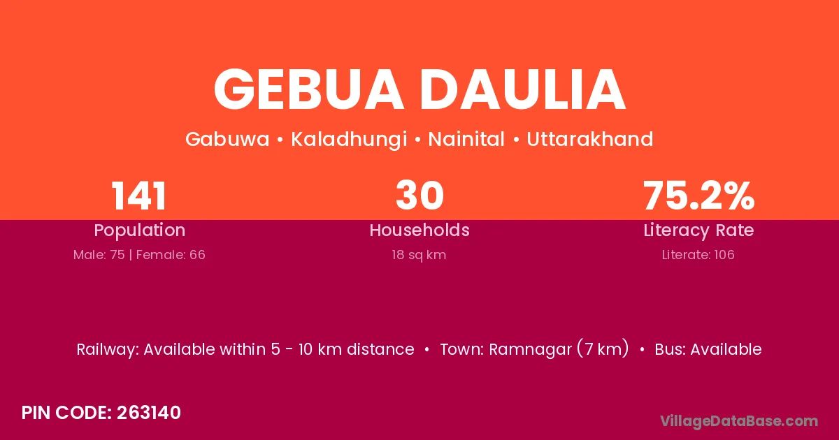 Ramnagar (7 km) is the nearest town to Gebua Daulia village for major economic activities and is located approximately 7 km away.