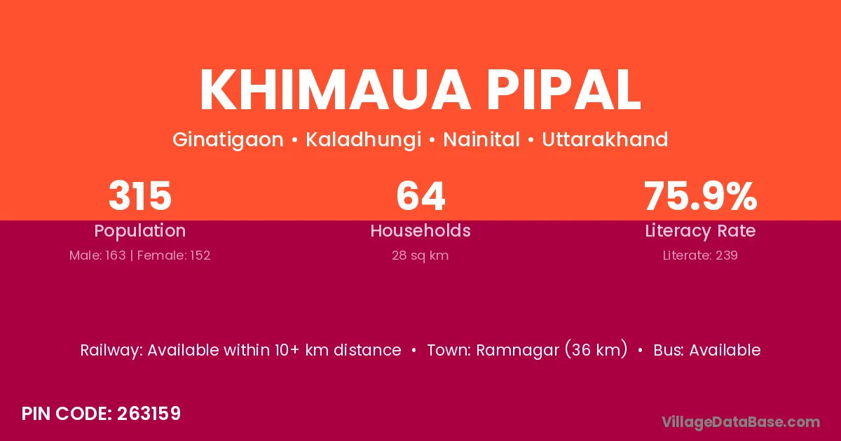 Ramnagar (36 km) is the nearest town to Khimaua Pipal village for major economic activities and is located approximately 36 km away.