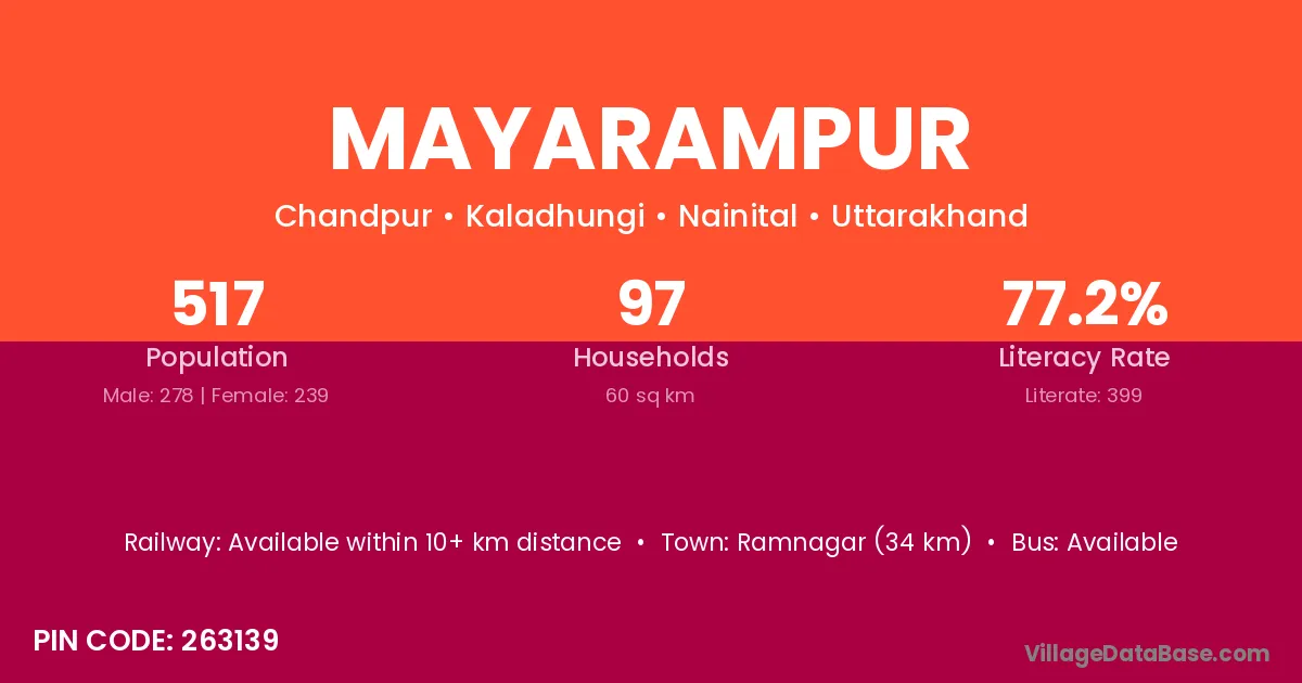 Ramnagar (34 km) is the nearest town to Mayarampur village for major economic activities and is located approximately 34 km away.