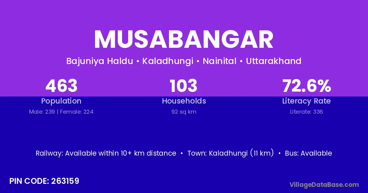 Kaladhungi (11 km) is the nearest town to Musabangar village for major economic activities and is located approximately 11 km away.