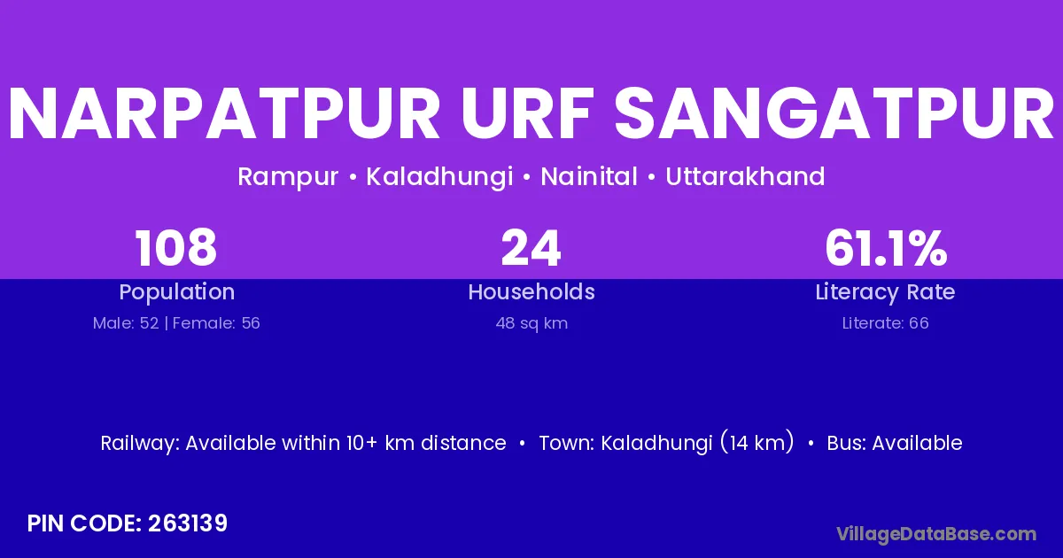 Narpatpur Urf Sangatpur village has a total population of 108 people, of which 52 are males and 56 are females.