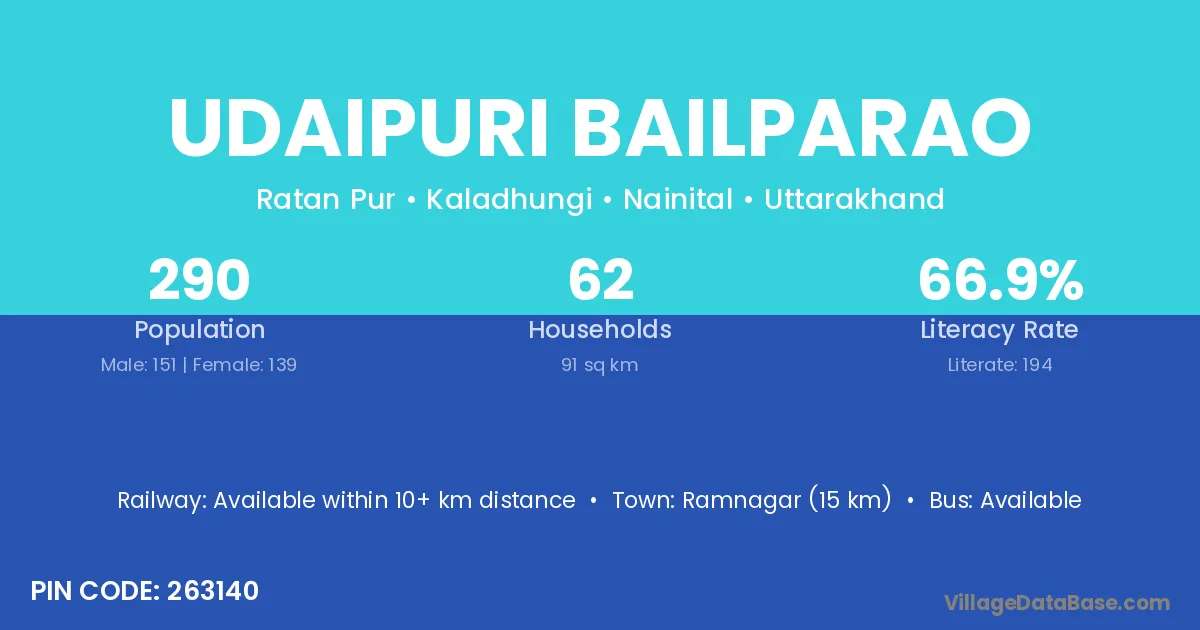 Ramnagar (15 km) is the nearest town to Udaipuri Bailparao village for major economic activities and is located approximately 15 km away.