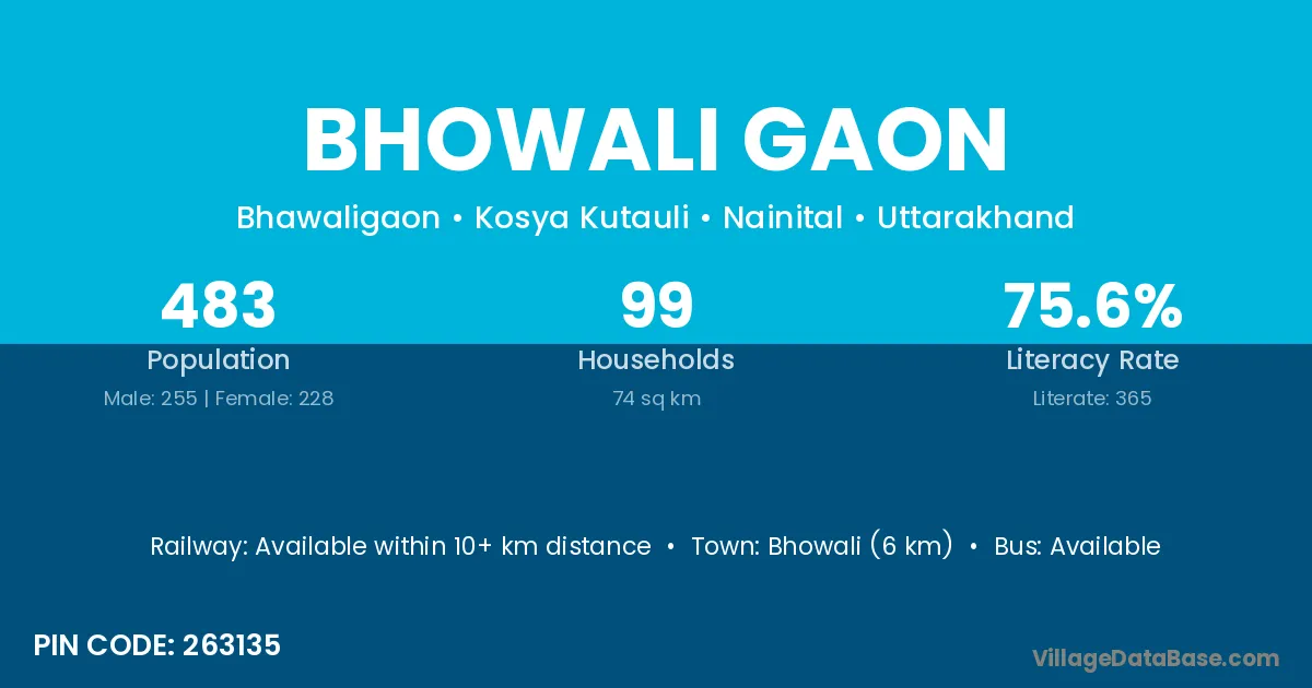 Bhowali Gaon village has a total population of 483 people, of which 255 are males and 228 are females.