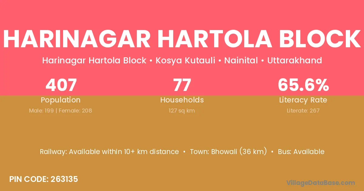 According to Census 2011 information, the village code of Harinagar Hartola Block village is 263135.