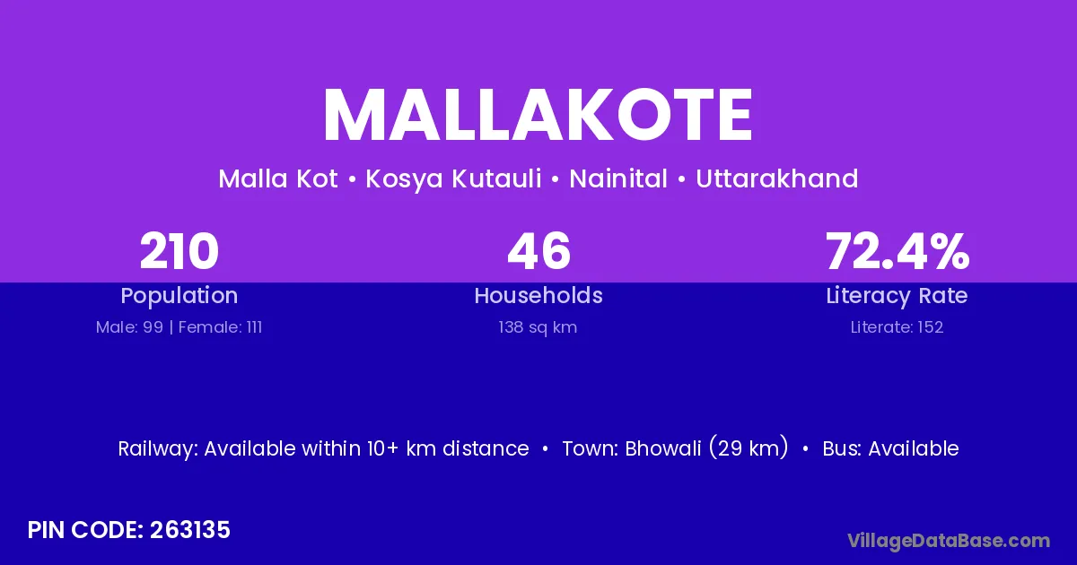 Bhowali (29 km) is the nearest town to Mallakote village for major economic activities and is located approximately 29 km away.