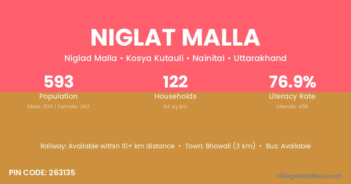 Niglat Malla village has a total population of 593 people, of which 300 are males and 293 are females.