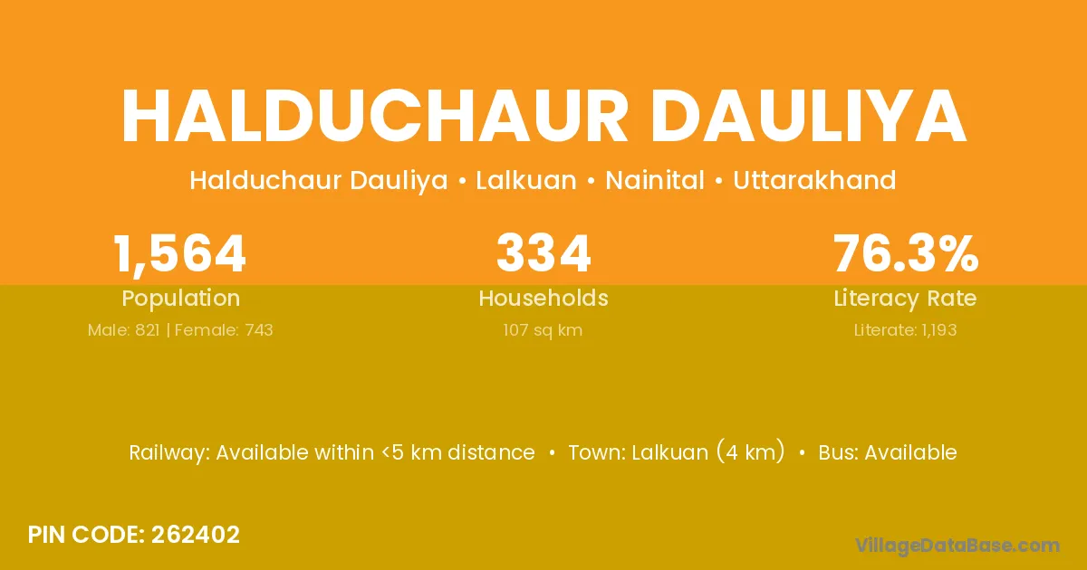 Lalkuan (4 km) is the nearest town to Halduchaur Dauliya village for major economic activities and is located approximately 4 km away.