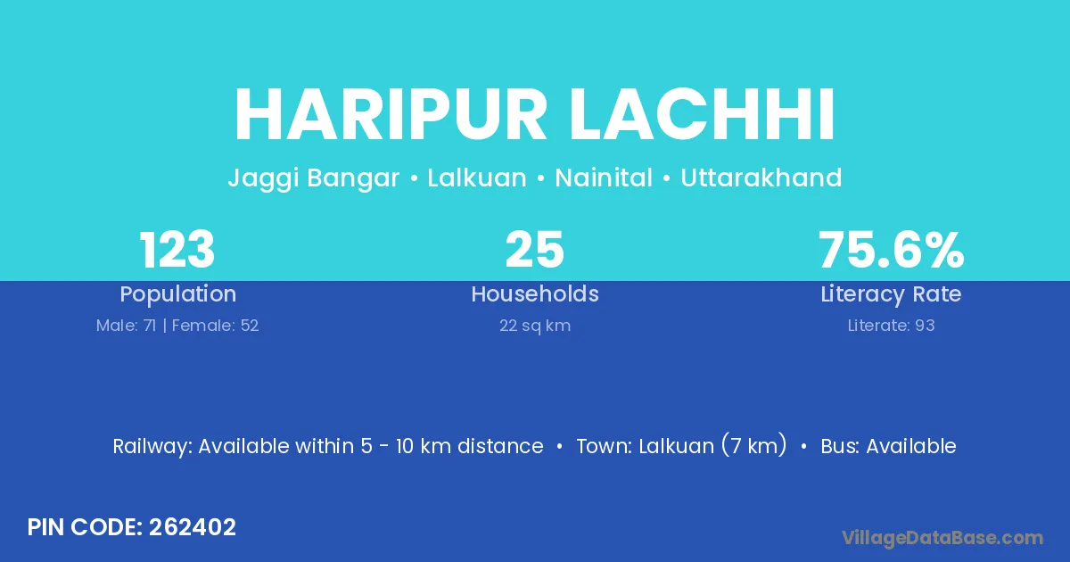 Lalkuan (7 km) is the nearest town to Haripur Lachhi village for major economic activities and is located approximately 7 km away.