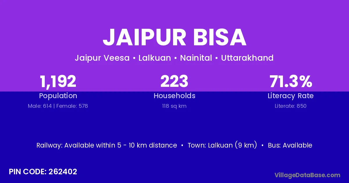 Lalkuan (9 km) is the nearest town to Jaipur Bisa village for major economic activities and is located approximately 9 km away.