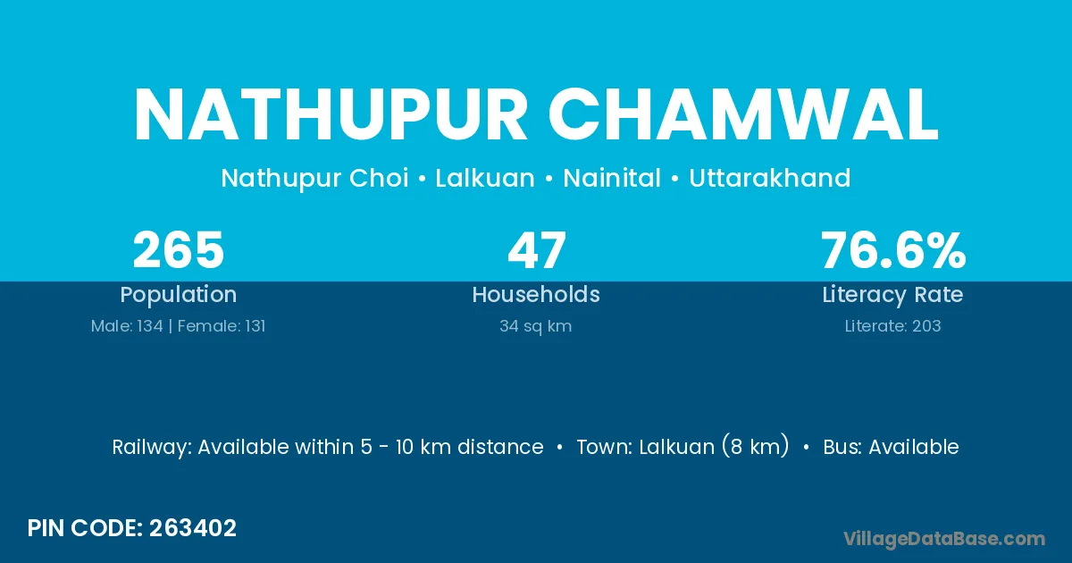 Lalkuan (8 km) is the nearest town to Nathupur Chamwal village for major economic activities and is located approximately 8 km away.